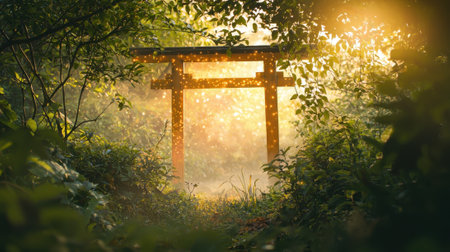 A tranquil setting showcases a vibrant torii gate framed by dense foliage, illuminated by soft sunlight filtering through the trees at dusk.