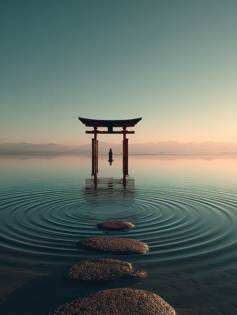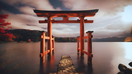 A stunning torii gate stands at sunset, surrounded by still water, creating a picturesque reflection. This serene scene evokes tranquility and beauty.