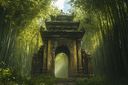 Nestled in a vibrant bamboo forest, this ancient temple exudes a sense of history and mystery. Sunlight filters through the dense greenery, casting a serene glow on the intricate carvings.