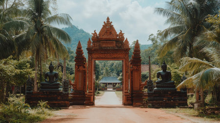 A stunning temple entrance, flanked by majestic Buddha statues and surrounded by lush greenery, offering a serene atmosphere perfect for exploration and reflection.