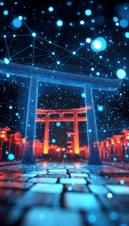 Fushimi Inari Shrine in Kyoto, Japan as a Neon Glowing Outline in Digital Network Style
