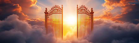 Golden gates open in heavenly clouds with sun rays shining through.