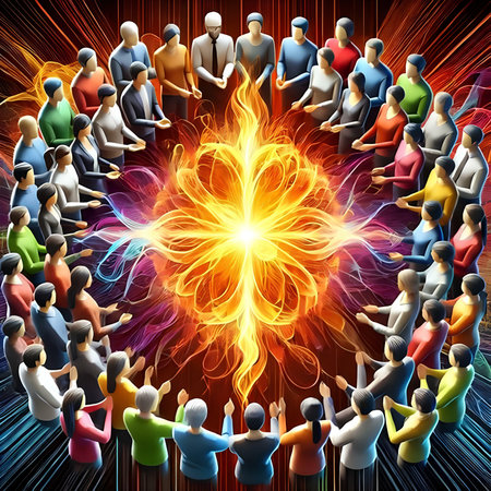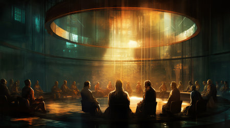 A serene moment of meditation with individuals gathered in focus around a luminous figure in a tranquil space.