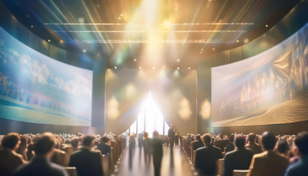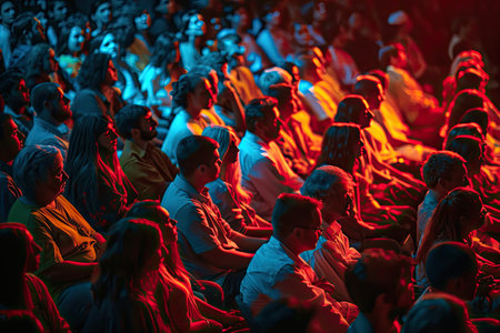 Large group of people sitting indoors, watching a performance on stage generated by artificial intelligence