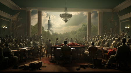 Attendees engage in a major political conference in a modern hall with sleek designs and high-tech screens showcasing key information.