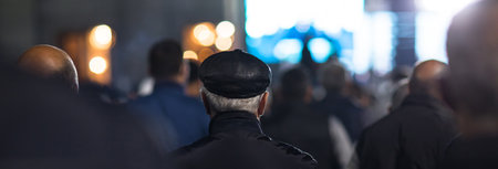 Group of people sitting on the bench and listening to speech of priest during mass