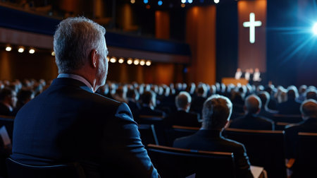 A man in a suit sits in a large auditorium with a cross on the stage. The audience is watching a religious event