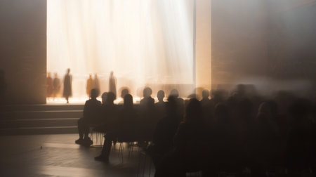 In a brightly sunlit hallway, a group of silhouetted people creates a warm and serene atmosphere as sunlight pours in through large windows, casting shadows on the floor