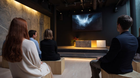An intimate setting with ambient sound and a large projection screen showing a film that morphs in style and narrative direction based on realtime feedback with interactive element