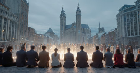 A diverse group of individuals sits quietly in a church, demonstrating a moment of reflection and unity. The atmosphere is respectful, with soft lighting enhancing the solemn ambiance.