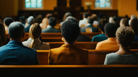 Individuals are seated quietly in wooden pews, their attention directed towards the speaker at the front. Soft sunlight filters through the windows, enhancing the peaceful atmosphere.