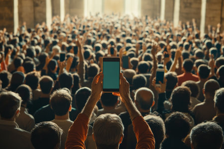 A crowd of spectators at an event filming the event on smartphones. Fans at an idol concert. Spectators at a concert
