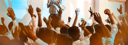 Excited people cheering in a lecture hall. AI generative