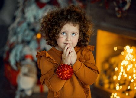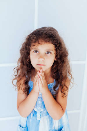 Portrait of a beautiful little curly girl in a blue dress on a white background