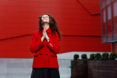 Happy young woman with curly hair dressed in red jacket stands looking up, is successful.