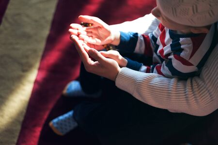 Muslim boy touching traditional Arabic lantern candle blowing in the dark. Middle-eastern boy praying. Thanking god. Ramadan, Eid-al-Adha concepts