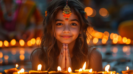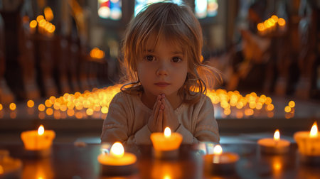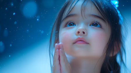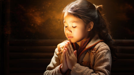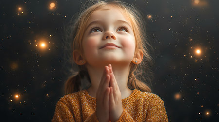 Praying child On a black background full of lanterns.
