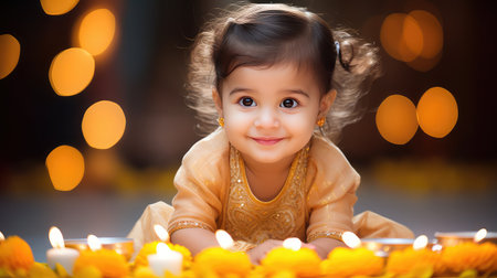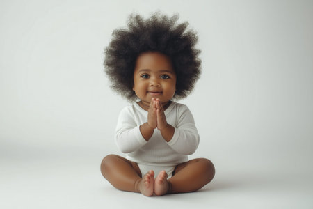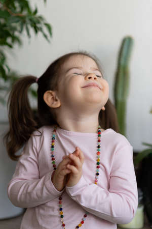 Happy smiling baby pray at home with crossed eyes.