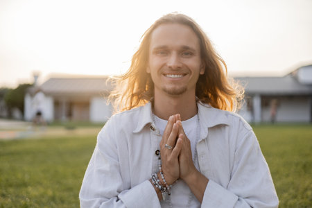 carefree long haired man with mala beads showing anjali mudra gesture and smiling at camera outdoors