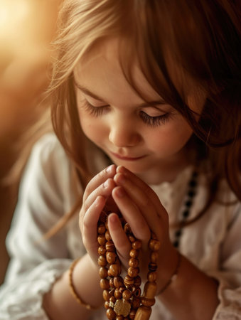 Young junior woman holding rosary, head down with eyes closed. Female hands holding a rosary with Jesus Christ Cross Crucifix. Month of Rosary, Christian Catholic religious symbol.