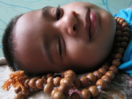 Buddhist monk. Closeup on Prayer beads. France.