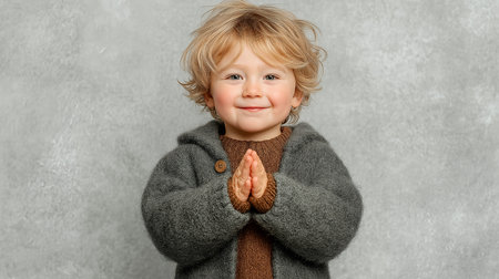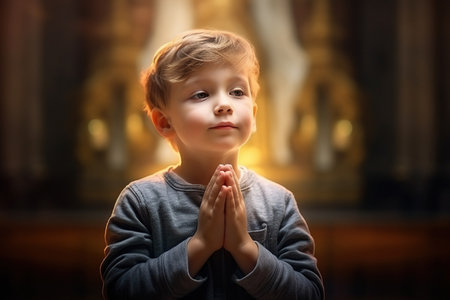 little boy praying to God with hands together stock photo