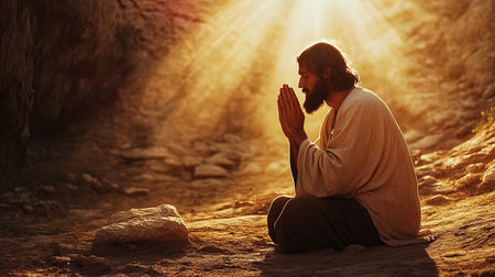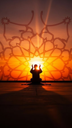 Religious muslim man praying in the mountains at sunset, prayer concept