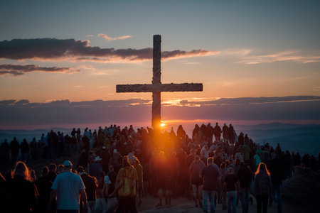 giant cross of christianity on the hill and faithful with candles.ai generated