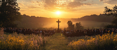 A serene outdoor worship gathering during sunset, with a large wooden cross surrounded by vibrant wildflowers and golden light.