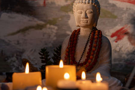 Buddha statue with burning candles in the temple, close up