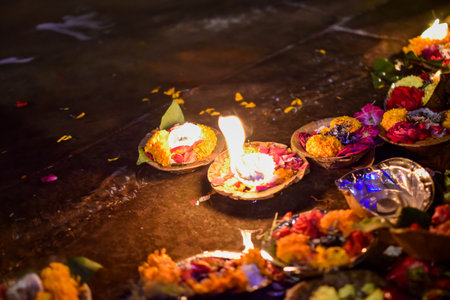 Colored Dishes with candles and flowers in offering floating on bank of Ganges