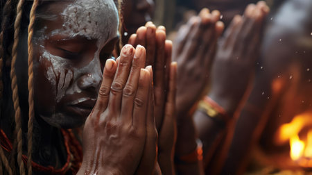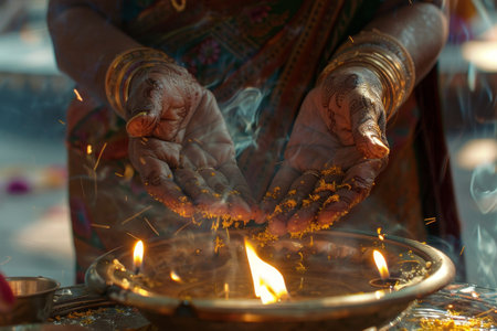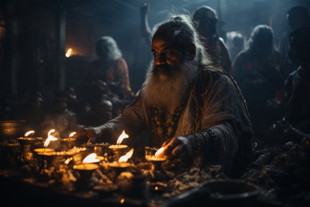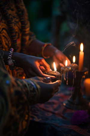 Hands Lighting Candles in Mystical Ritual Setting with Traditional Attire.