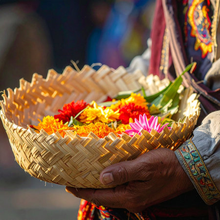A devotee's hands gently cradle a hand-woven basket filled with vibrant marigolds and other sacred blossoms.