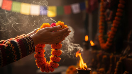 Hands pray with marigold garland, smoke, oil lamps, prayer flags