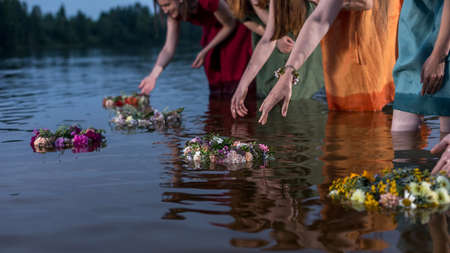 Lovely girls by the fire at night. Ancient pagan origin celebration concept. Night of Ivan Kupala.