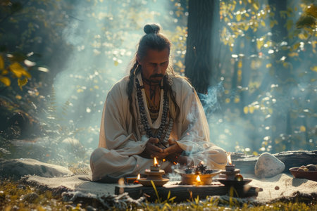 An enigmatic shaman adorned with tribal attire performs a spiritual ritual in the heart of a misty forest, invoking a sense of ancient traditions.