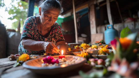 Elderly woman creates traditional floral offering with candles and vibrant flowers in a rustic indoor setting during the afternoon