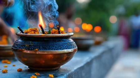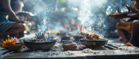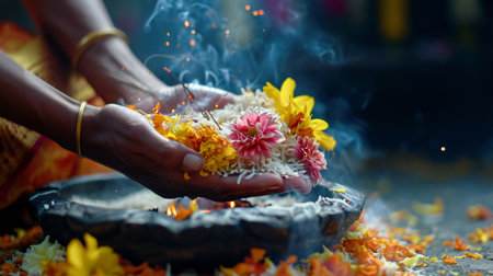 Vibrant Flower Offerings in a Ritual Ceremony with Smoke