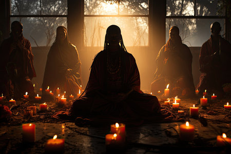 Warriors in pose in the dojo enlightened in candlelight., generative AI