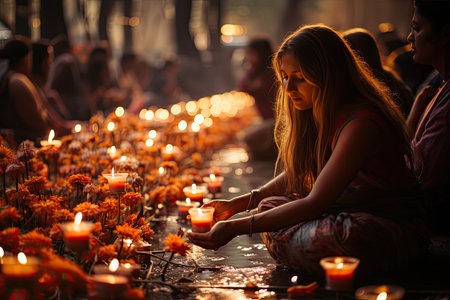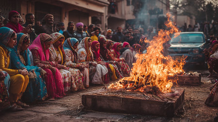 Bonfire with flowers and candles during Holika Dahan celebration in India, AI Generated