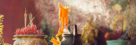 Incense sticks on joss stick pot are burning and smoke use for pay respect to the Buddha, respect to the Buddha in Buddhism life Pray in buddha. BANNER, long format