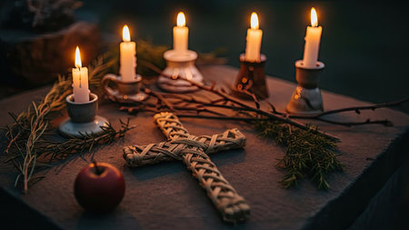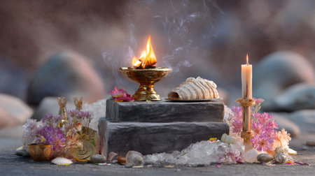 A serene traditional altar featuring a flickering candle and incense, surrounded by delicate flowers and shells, embodying peace and spirituality.