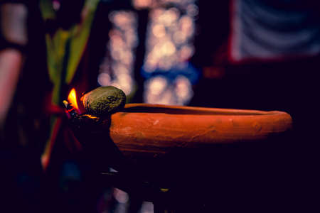 Creative photography of a realistic burning mud oil lamps in Diwali, an Indian festival in evening. Colorful red, yellow, orange fire flame lit on dark night shadow background with noise grain effect.