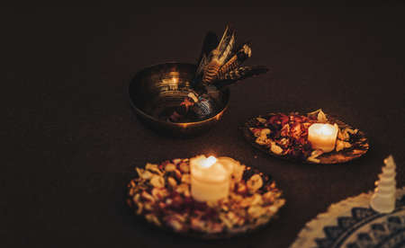 beautiful tibetan bowl and candles. Ceremonial space.