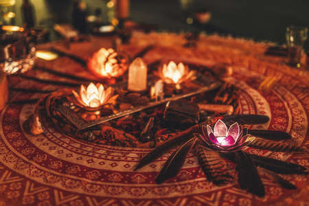 Occult white magic ritual of fire using grimoire, old book, candles