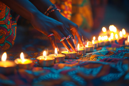 Woman's hands arranging votive candles on patterned African fabric during a ceremony