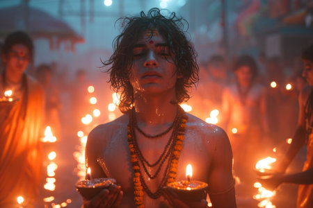 A solemn man is seen praying before an ancient shrine, enveloped in fragrant incense, with flickering lights around him, embodying deep spirituality and devotion.