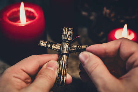 Man stitching needles in a voodoo or vodun puppet, dark witchcraft ritual for pain and magic