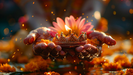 This image features hands performing a water pouring ritual, likely as part of a traditional ceremony. The focus is on the action and detail, with golden bowls and accessories creating visual appeal. The scene is illuminated by soft light, suggesting an indoor setting. Suitable for themes related to spirituality or cultural practices, this image may be used in various commercial applications.