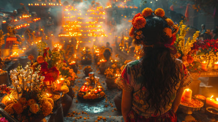 Dia de los Muerto, Mexican holiday. woman admiring her completed ofrenda altar, its vibrant colors and meaningful arrangements reflecting the depth of her love and respect for her ancestors.